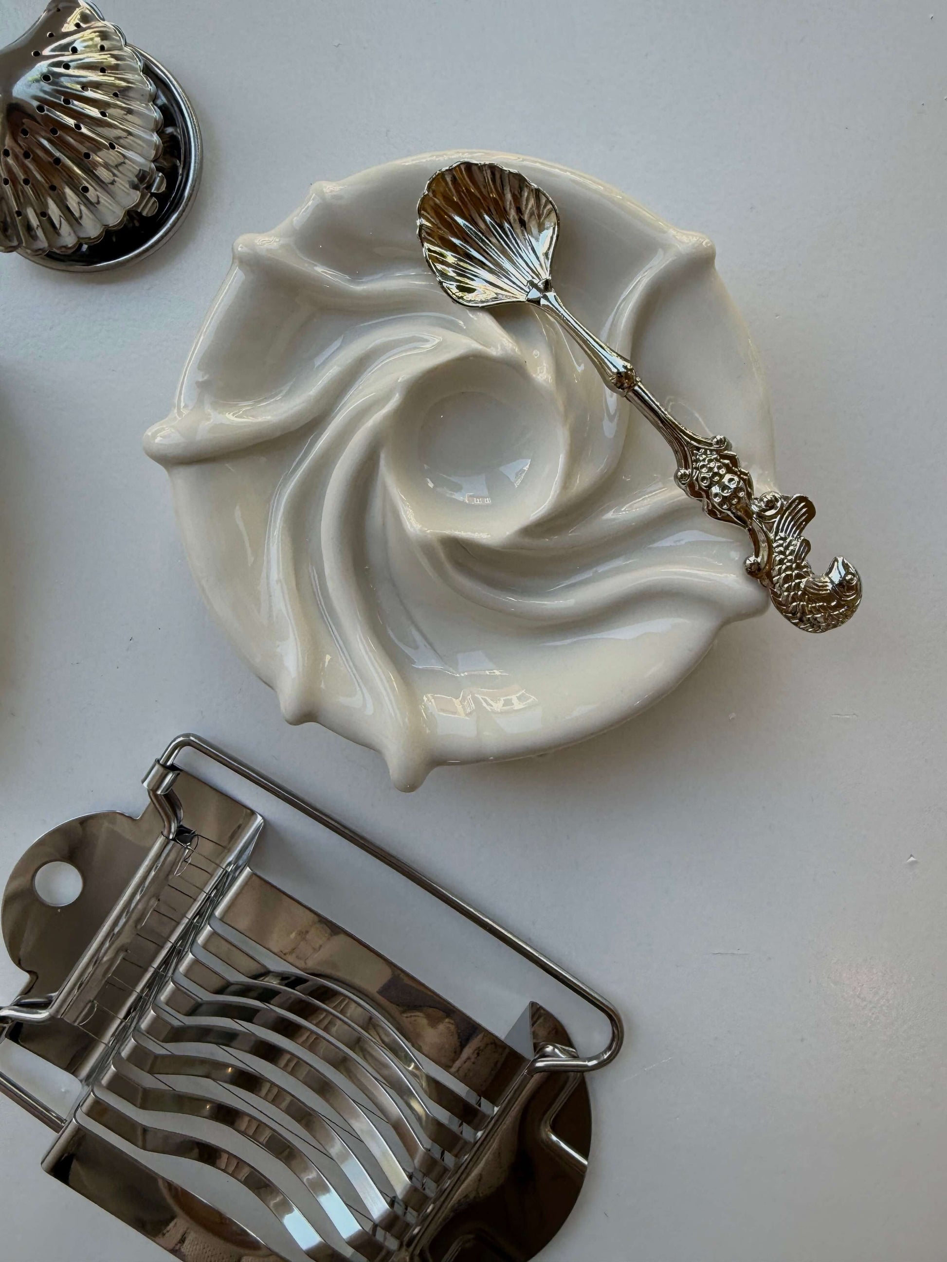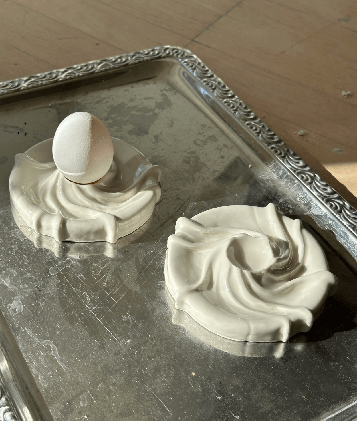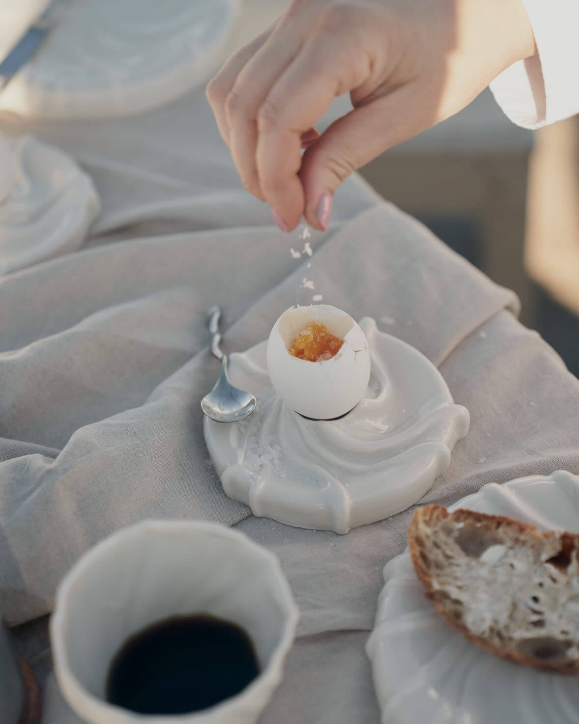 Æggebægeret har en lille kant, hvorpå du kan ligge din ske, dit salt eller dine skaller.