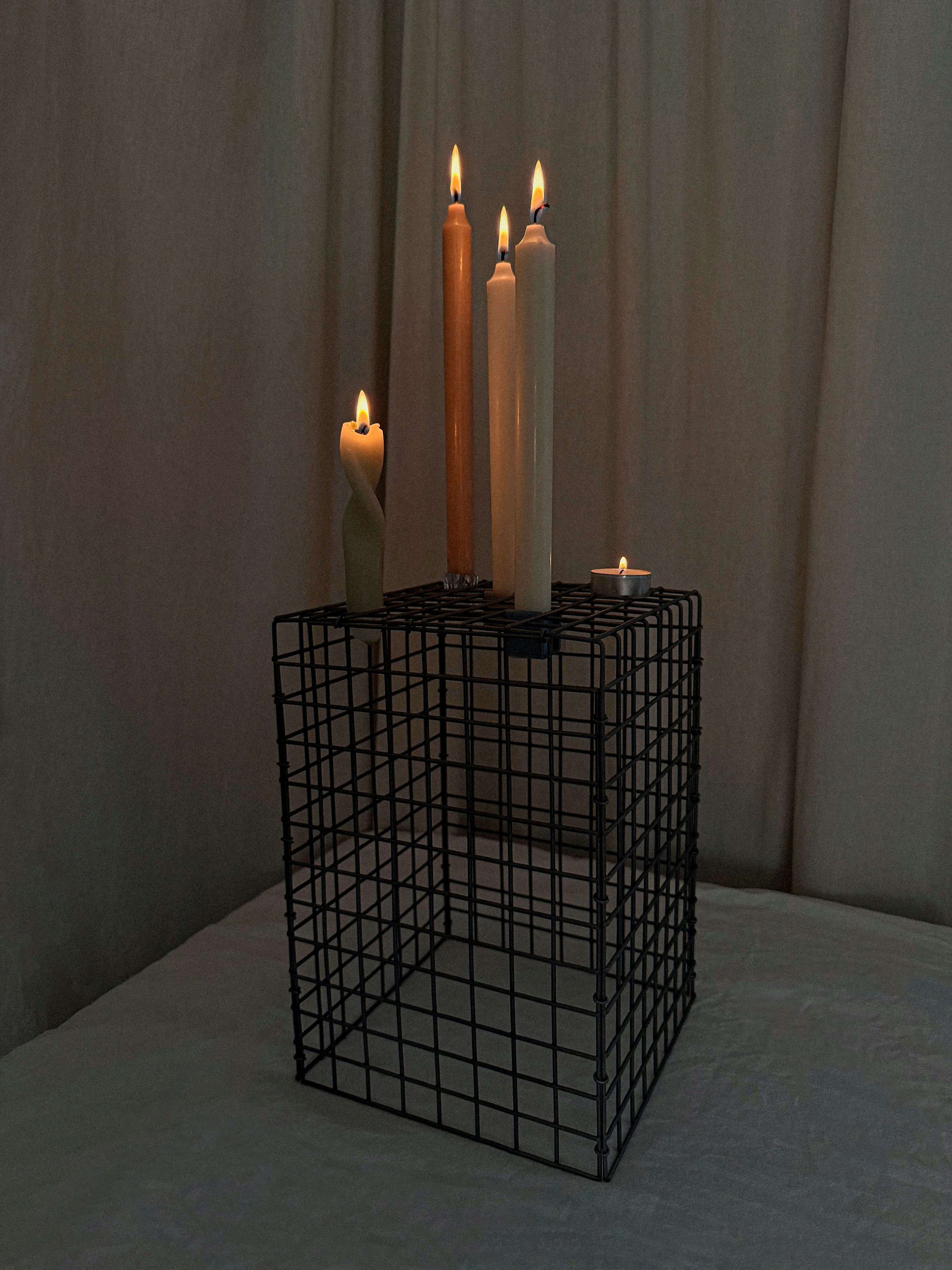 Grid 01 er den største lysestage i Candle Stories-kollektionen. Den er skabt til at stå solitært på gulvet, på en piedestal eller som markant centerpiece i hjemmet. En stor, håndlavet lysestage i dansk design, formet i trådnet og skabt til at invitere til kreativ iscenesættelse.