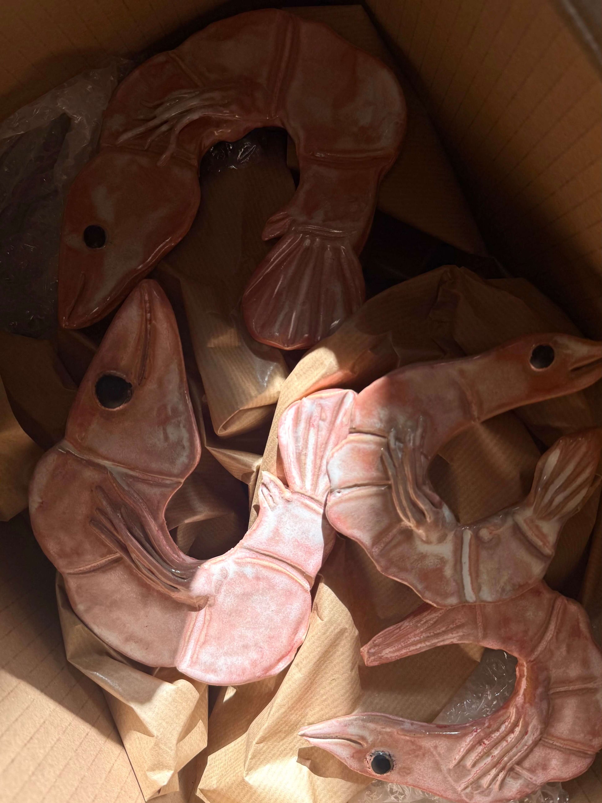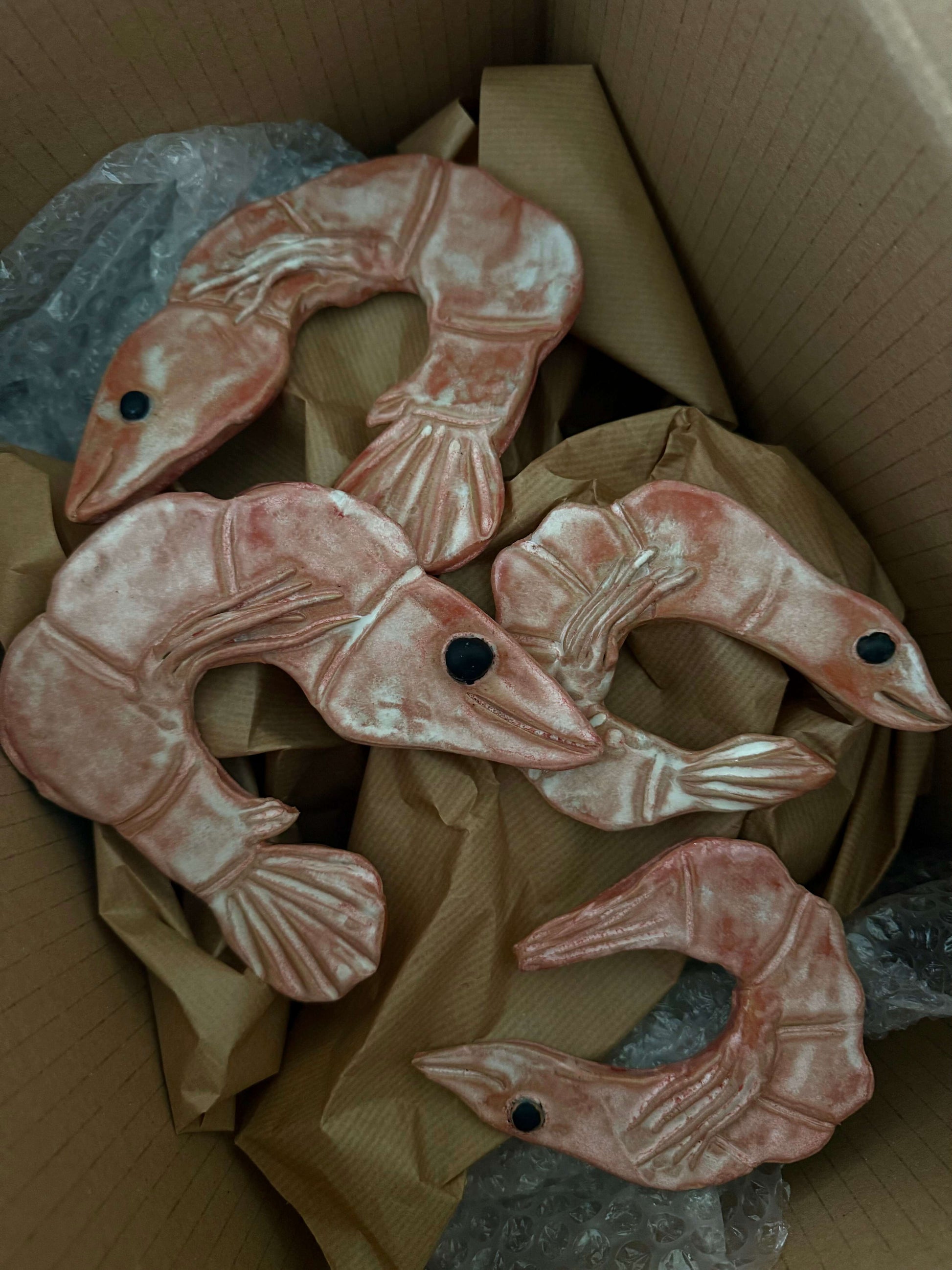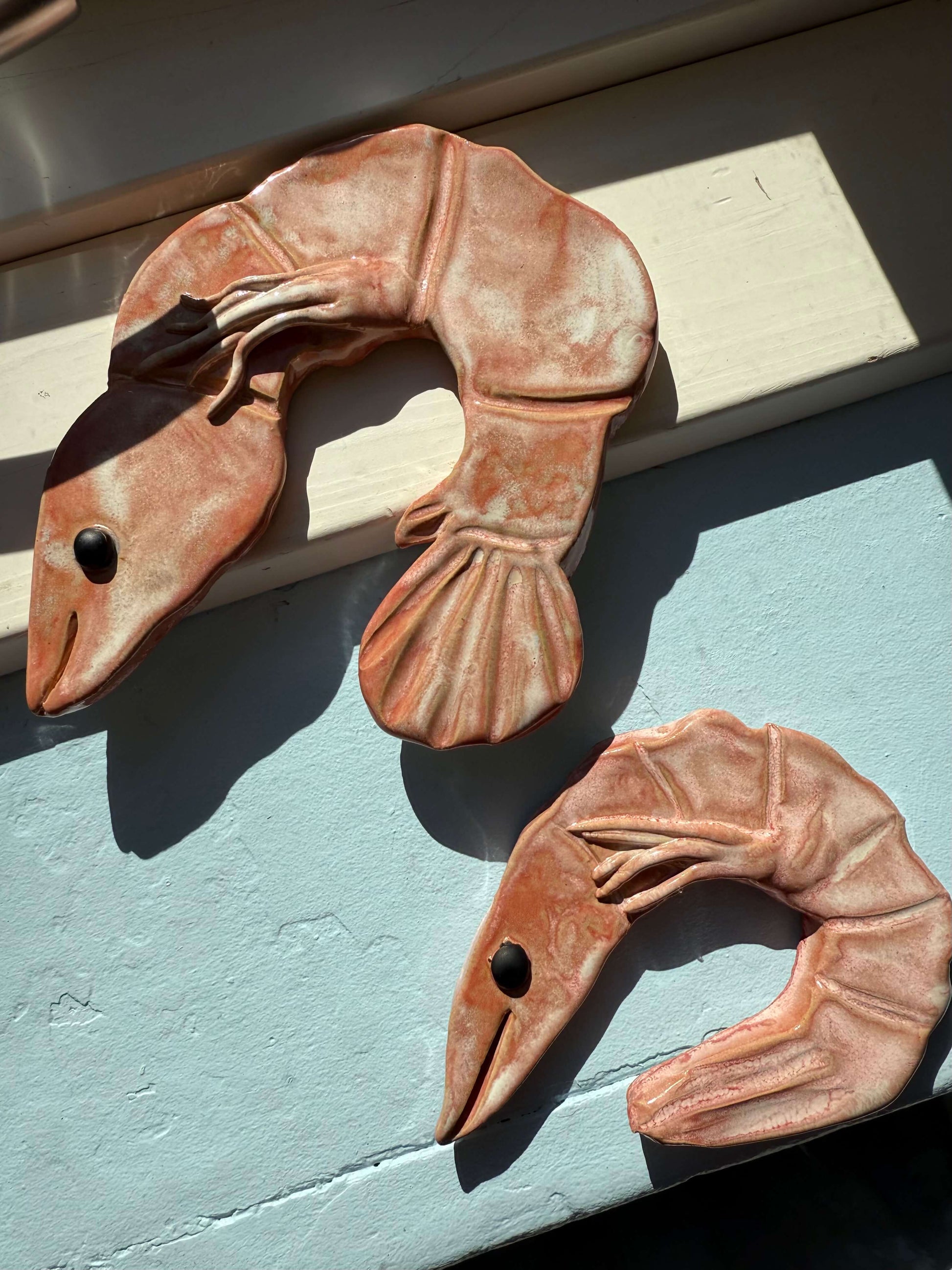 Disse smukke, håndlavede keramikrejer er skabt med sans for detaljen af en lokal kunstner i Horsens. Hver reje er formet og malet i hånden, hvilket giver et levende og autentisk udtryk.