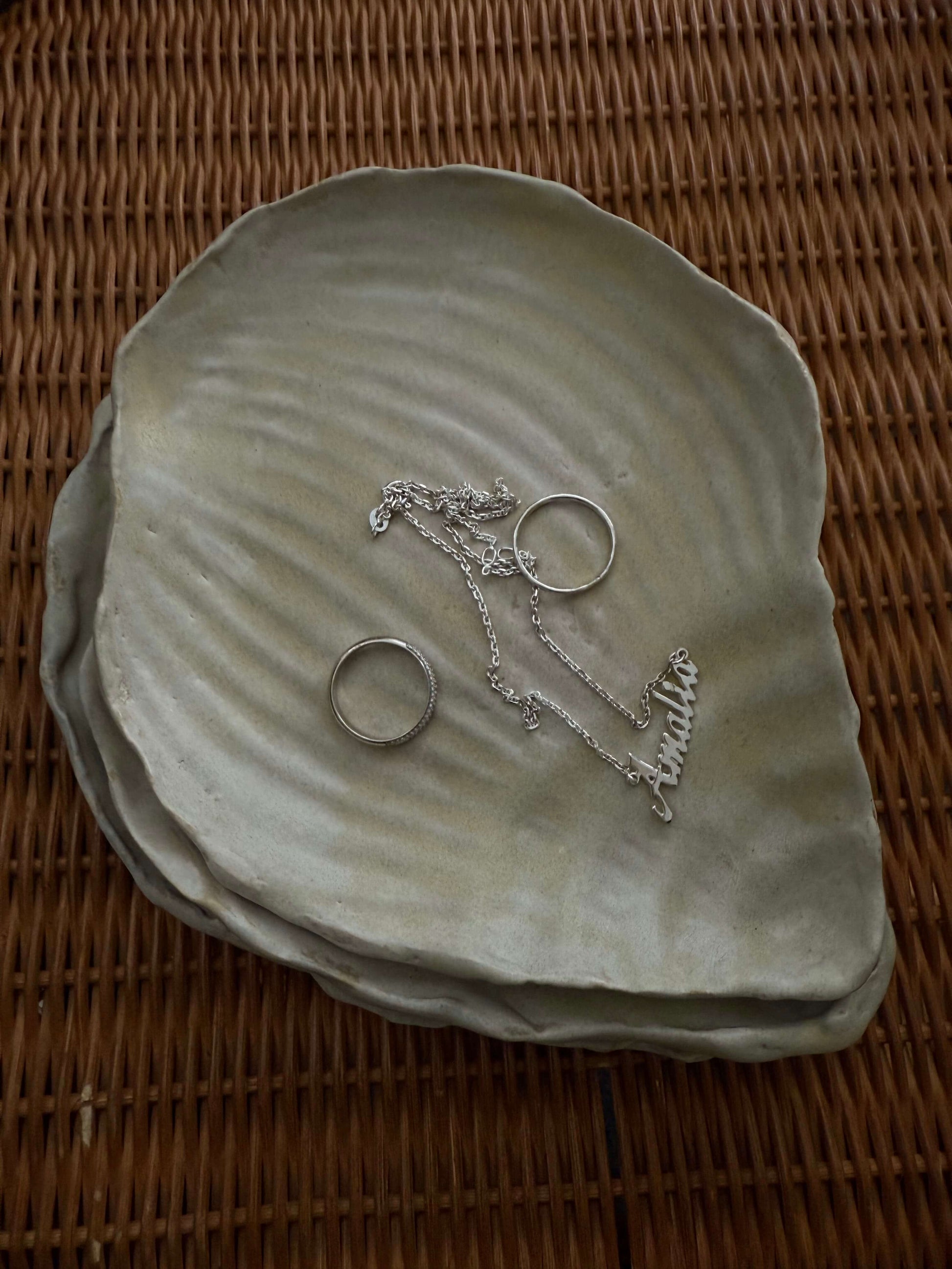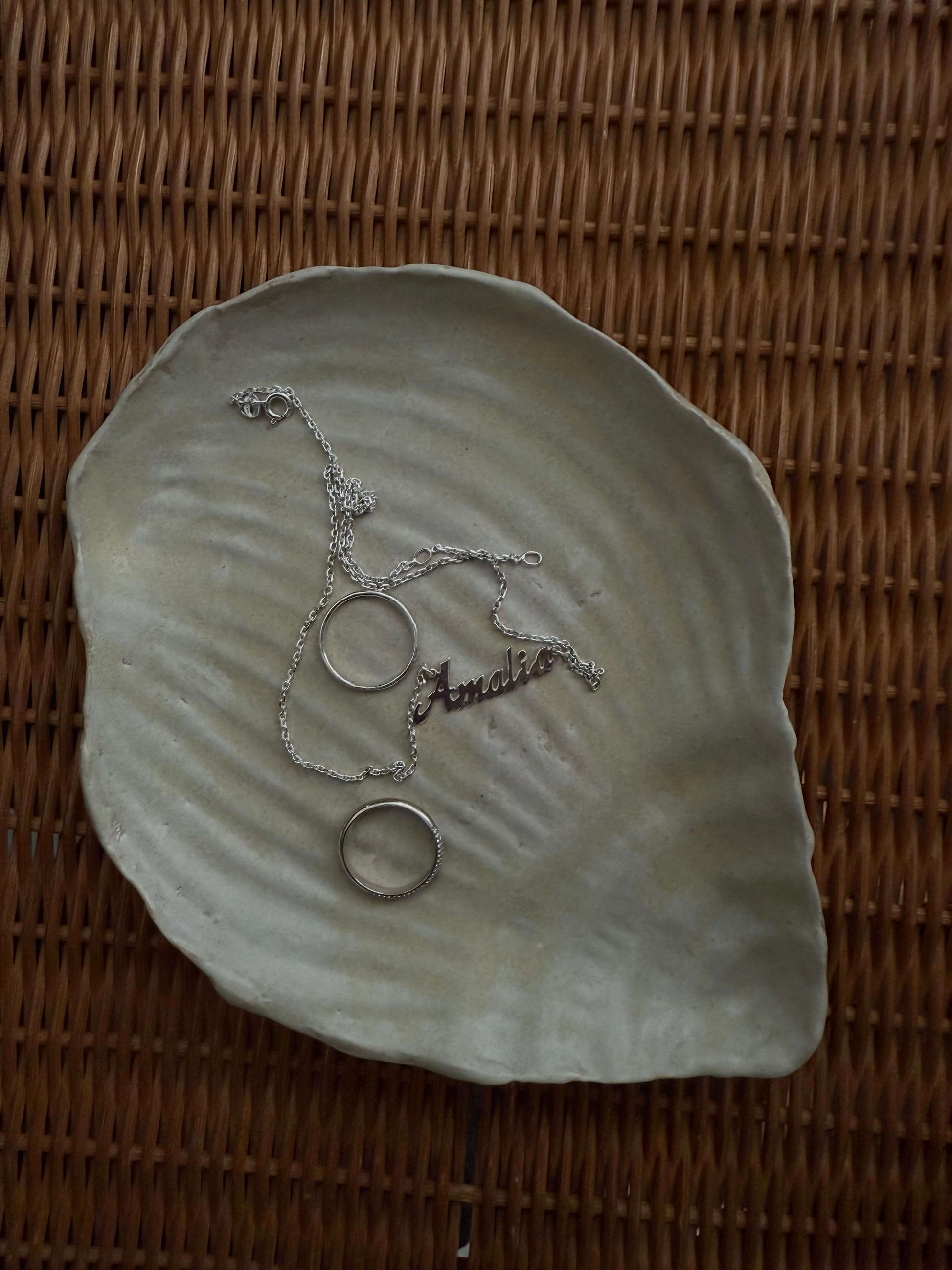 Dette håndlavede fad er formet som en konkylie med smukke, naturlige detaljer. Det elegante, maritime udtryk gør fadet til et dekorativt kunstværk i sig selv – uanset om du bruger det til servering, til lys, nips eller dine smykker.